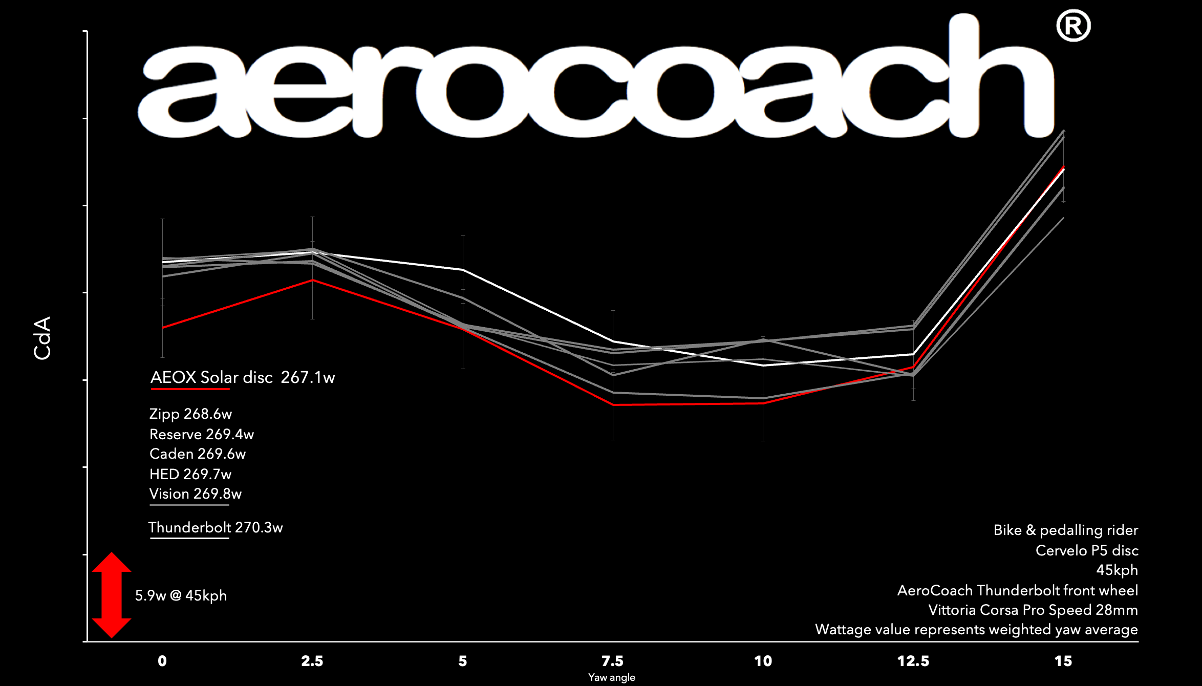 This graph shows wind tunnel data comparing the AEOX® Solar disc against a Zipp Super 9, Reserve, Caden, HED Vanquish, Vision Metron SL & a Thunderbolt trispoke rear. All wheels were mounted with a Vittoria Corsa Pro Speed in 28mm. Test speed was 45kph.