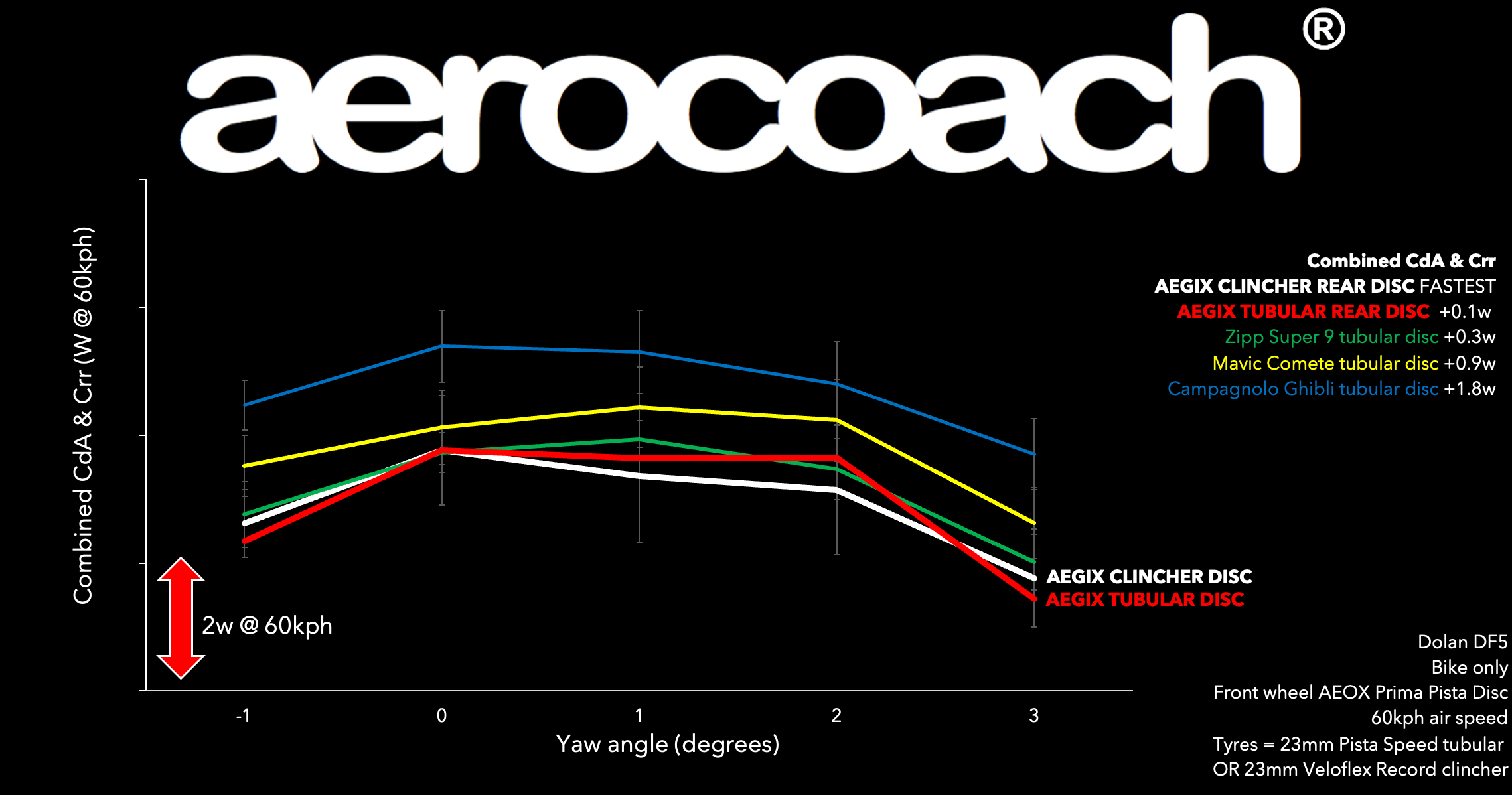 Rear AEGIX tubular discs are designed to work optimally with 23-25mm tubular tyres, and combined CdA/Crr comparisons of the rear AEGIX disc against the competition can be found below.