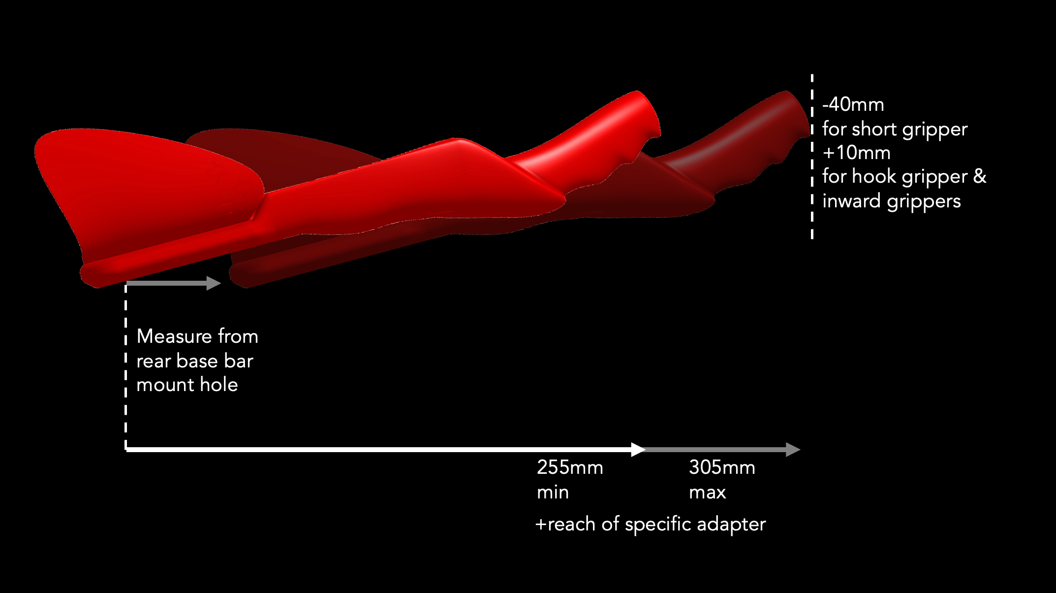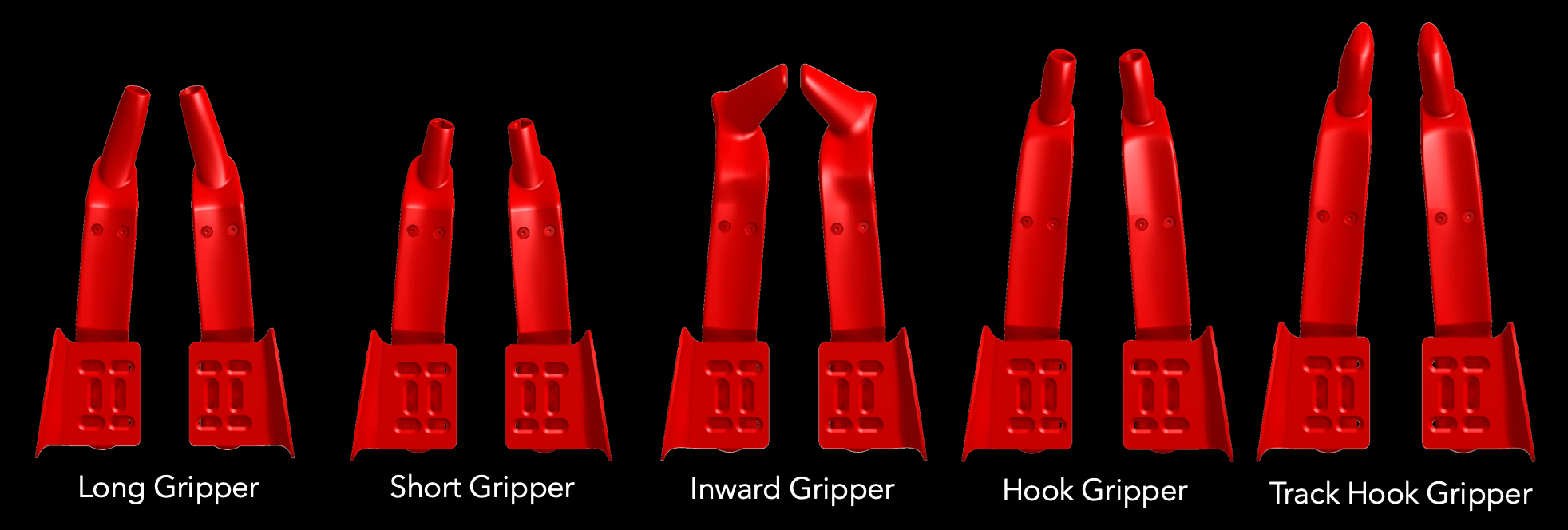 Grippers can be made with an additional 40mm of reach added to the straight part that follows the lower arm. Please refer to the reach diagrams further down this page which show dimensions without extra reach added.